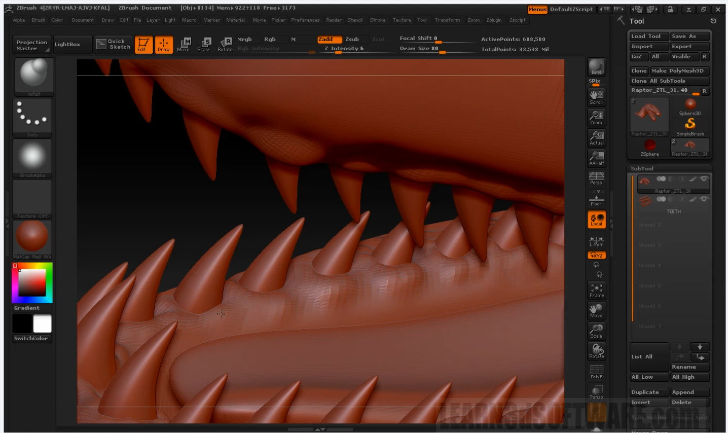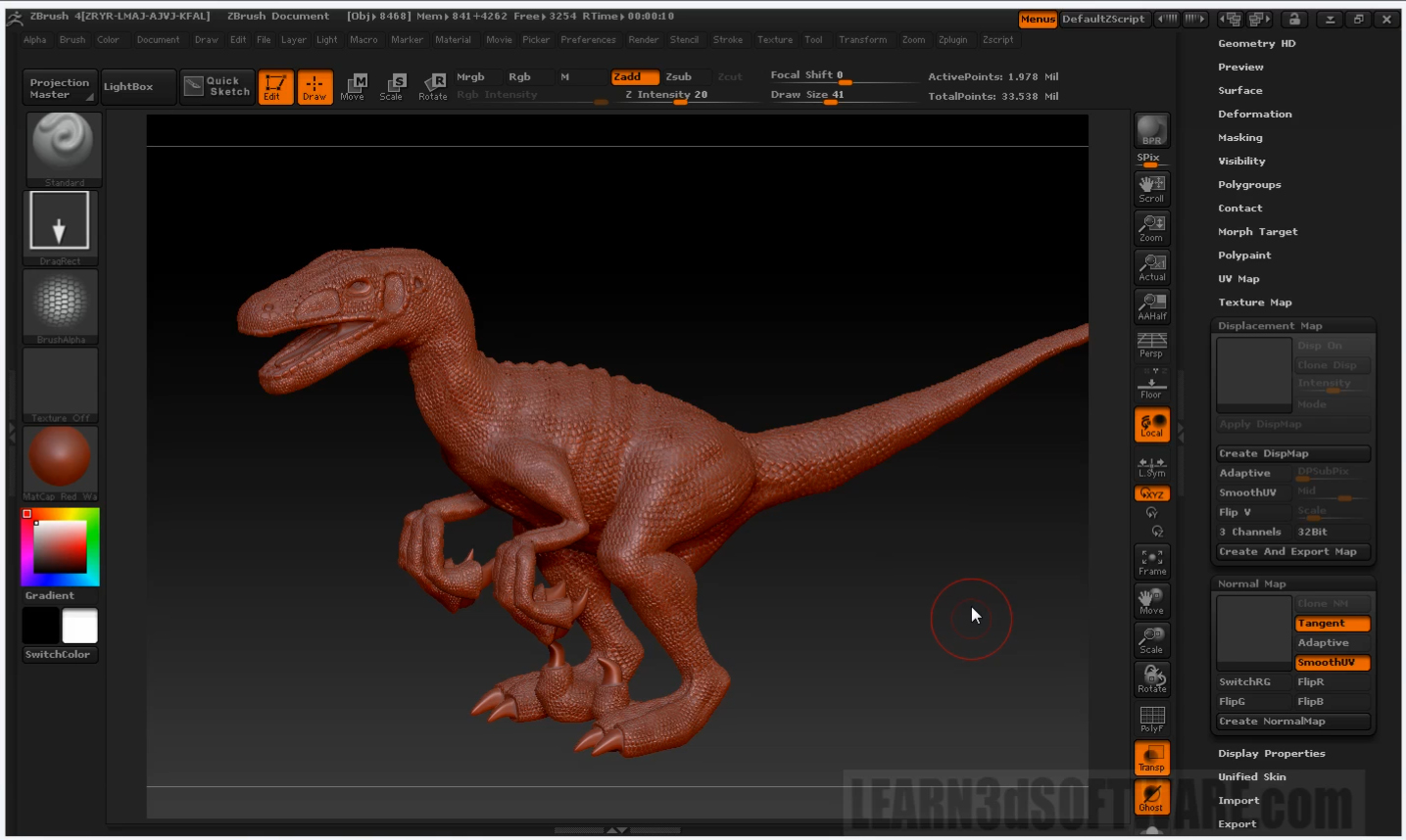 ZBrush 4 for LightWave Users-Normal Maps In this videos series we show 3D students how to use ZBrush 4 and LightWave 3D together as an easy and functional workflow and pipeline in your 3D projects. Although this video series uses LightWave 3D as the final output for your ZBrush work, most of the concepts, principles and techniques used here will work with all the most popular 3D programs like 3D Max, Maya, Softimage, Modo, Cinema 4D and many others. In this video tutorial ZBrush/LightWave Instructor Adam Gibson shows how to use ZBrush to create high detail sculpting on a Velociraptor dinosaur that is exported as a Normal Map for use inside of LightWave 3D.
